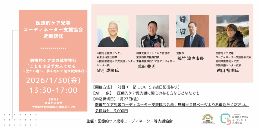 当協会において、医療的ケア児等コーディネーターがコンサルタントとして関係者・機関を交えた協議の場をつくる上でのTipsを共有できる研修会を企画しました。ぜひ、ご参加ください。